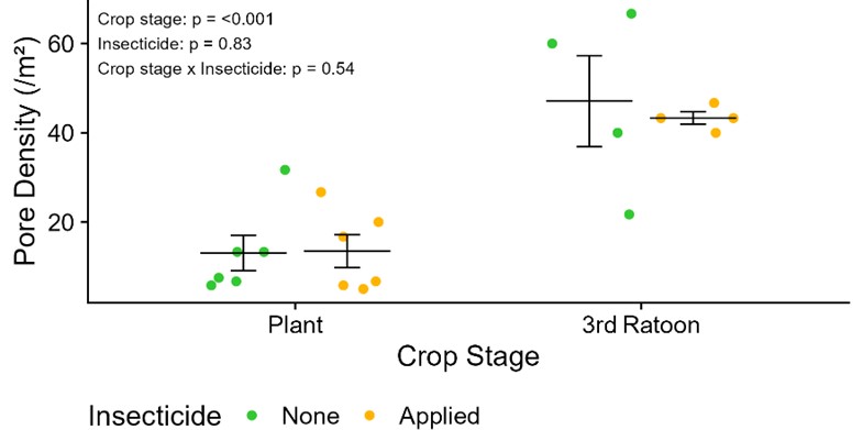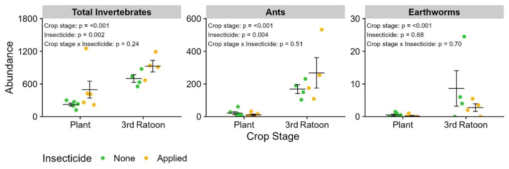 Study Overview: To address this research gap, a factorial design was utilised, assessing two factors: crop stage (recently cultivated ‘plant’ crop, <6 months vs. established ‘third ratoon’ crop, 3–4 years) and insecticide application (bifenthrin applied at planting vs. untreated). Four treatment combinations were established: Non-Insecticide/Plant, Insecticide/Plant, Non-Insecticide/Third Ratoon, and Insecticide/Third Ratoon, with 4–6 replicates per group. Macroinvertebrate abundance, order level richness, and composition were measured. Additional parameters included surface pore density and total organic and labile carbon at soil depths of 0–5 cm and 5–25 cm. Particular attention was paid to ants and earthworms due to their significant roles in organic matter incorporation.