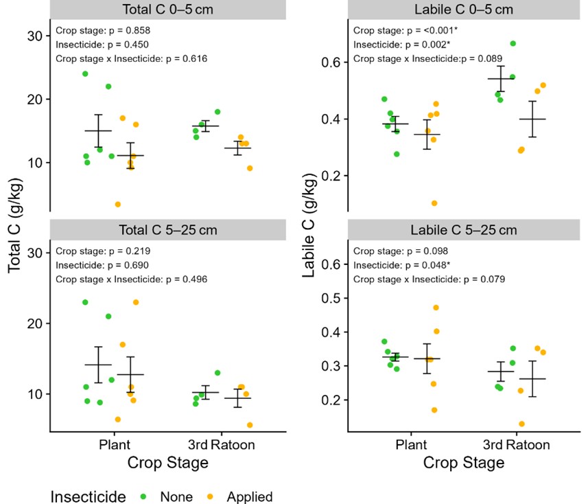 Given carbon’s complexity and site-specific nature, longer-term studies comparing crop stages (plant vs. ratoons) within the same paddock and cycle are needed to confirm potential long-term benefits. Additionally, the effect of Bifenthrin should be further studied, comparing more farmers, and to assess if the increase in labile carbon in non-insecticide plots is because of increased microbial activity, more organic input from plants, increased macroinvertebrate activity not displayed by abundance data.