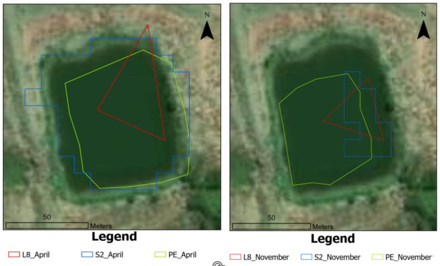 At the individual scale, anthropogenic farm dams (amongst other complicated geometry waterbodies) were selected due to their simple geometry for satellite detection. In figure 3, the varying detection capabilities between Landsat, Sentinel-2 and PlanetExplorer are seen through the products differing resolutions. It can be stated that Planet satellites had the most accurate detection of water between the wet and dry seasons as the geometry of detection best matches the shoreline of the water body. Sentinel-2 detected full surface area of water extent in wet season but struggled in the dry season. Finally, Landsat did detect water in wet and dry seasons but failed to quantitatively show an accurate depiction of surface area water extent.